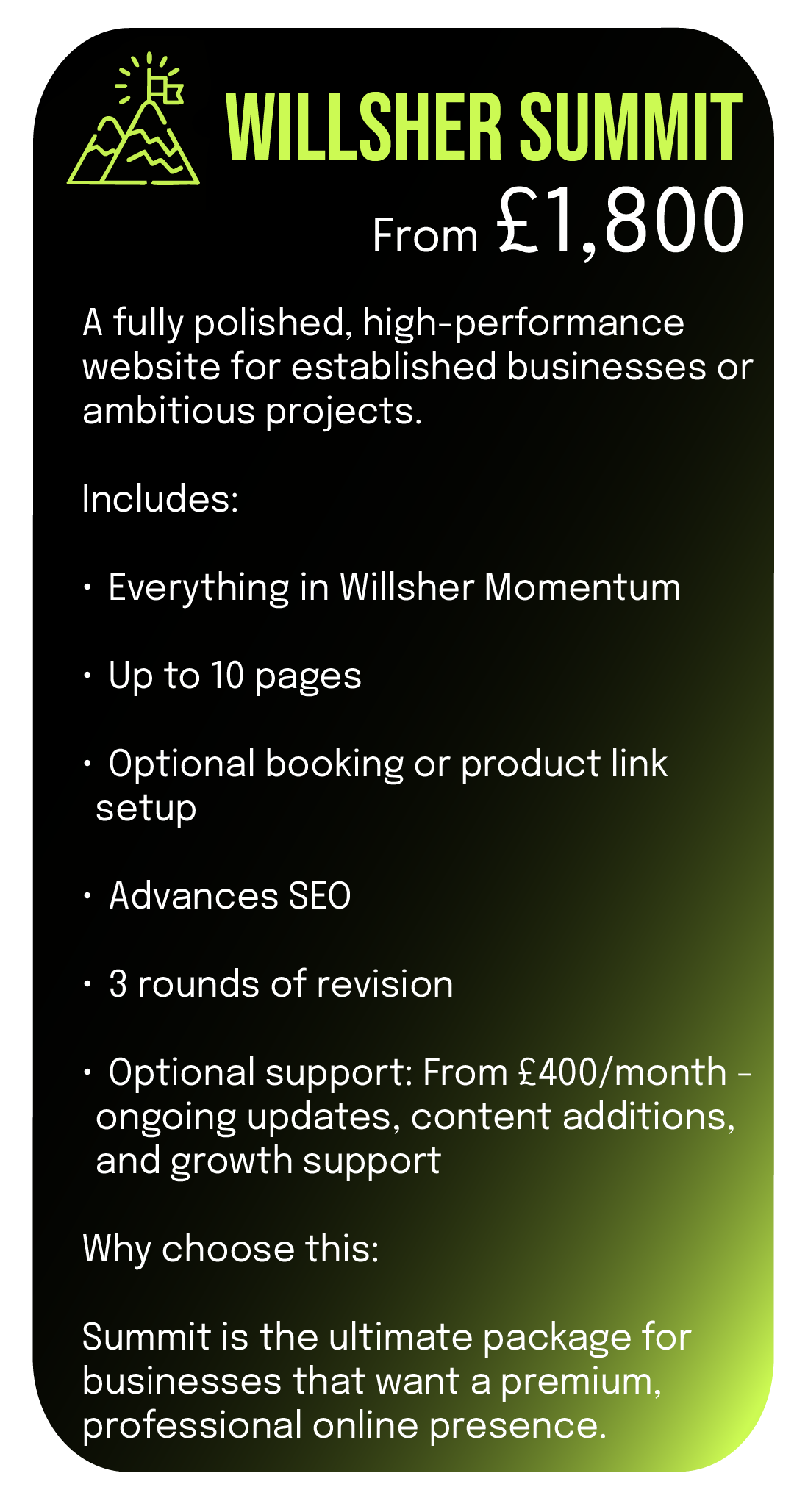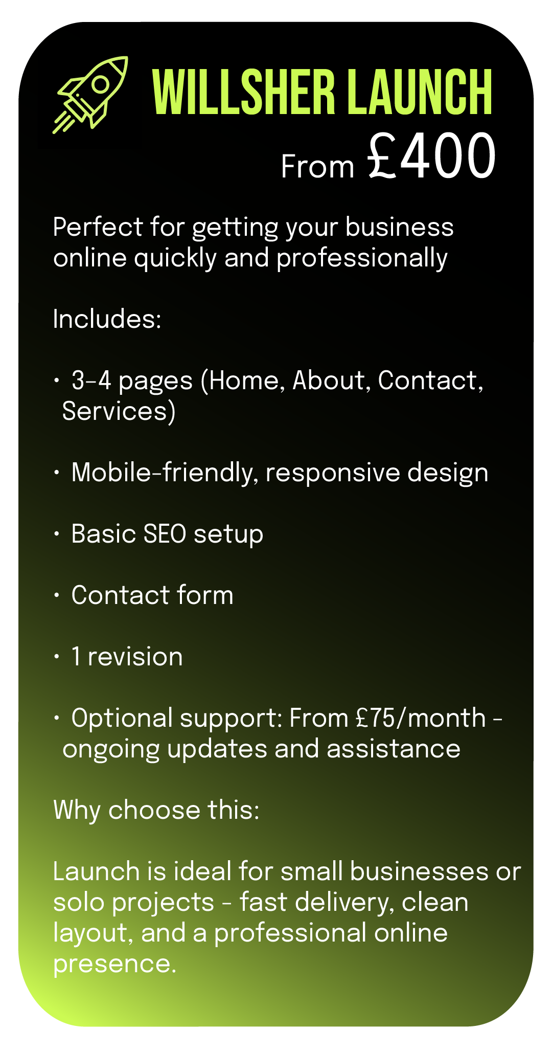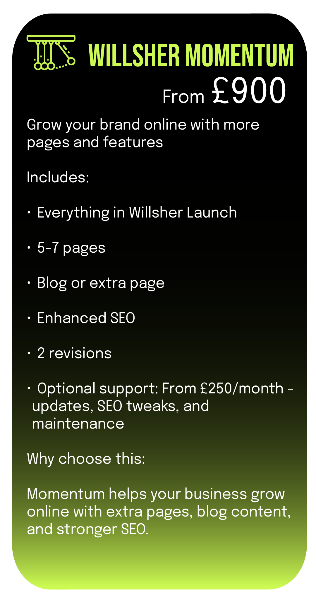 At Willsher Digital, I craft bespoke Squarespace websites for professionals and small businesses who want their online presence to feel sharp, effortless, and built with purpose. From clean layouts and custom graphics to smooth interactions and strategic messaging, every site is designed to reflect your brand and keep visitors engaged.
